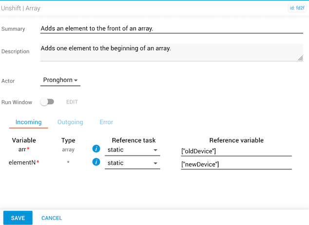 Suppose you have an older device listed for updating in a dataset and you want to insert a new device that should receive the update first. Use the unshift task to place the new device at the beginning of the dataset.