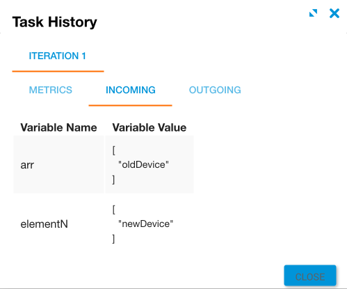 In this example, the reference value for arr is ["oldDevice"] and elementN is statically set as ["newDevice"].