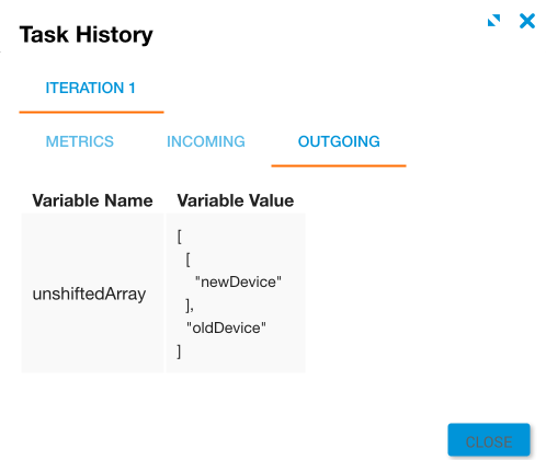 Outgoing tab showing newDevice at the beginning of the array before oldDevice