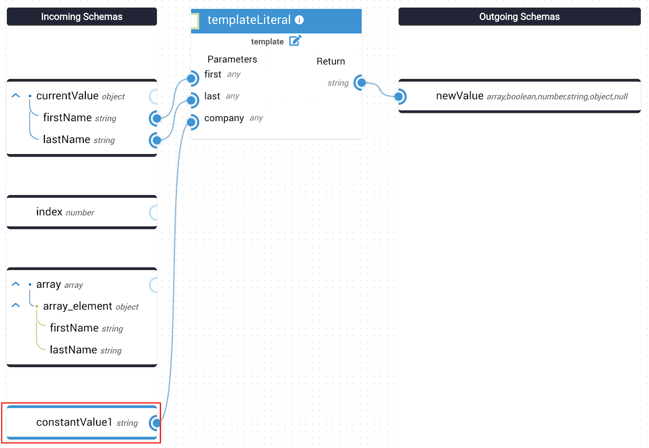 An outgoing schema defines the structure of the data leaving the JST. Data being operated on must be connected to an outgoing schema to appear in the JST’s output.