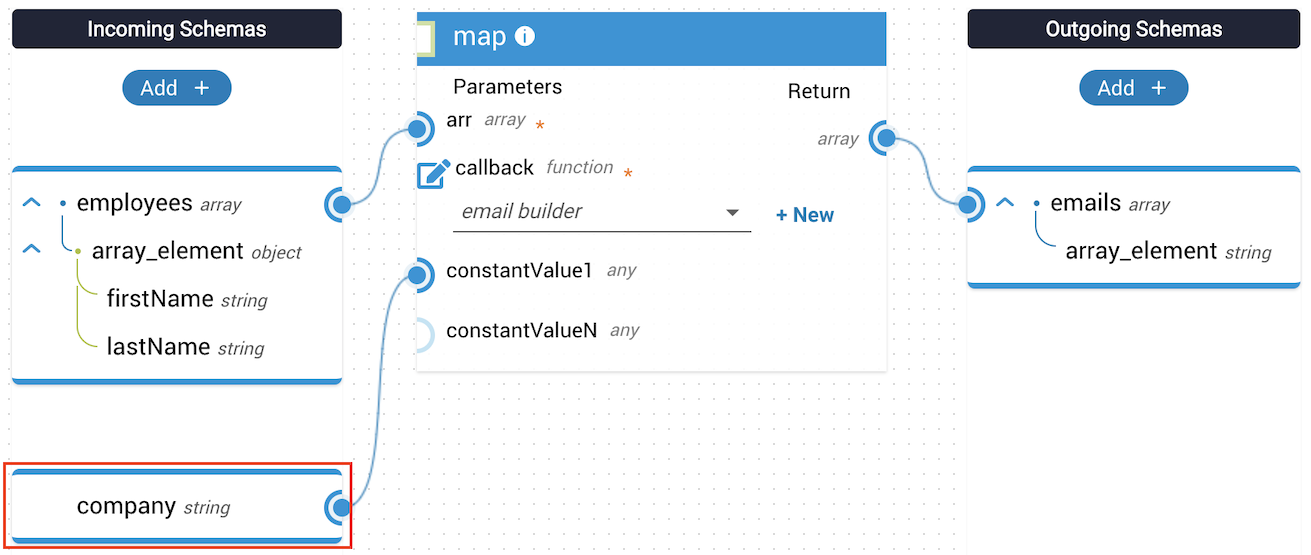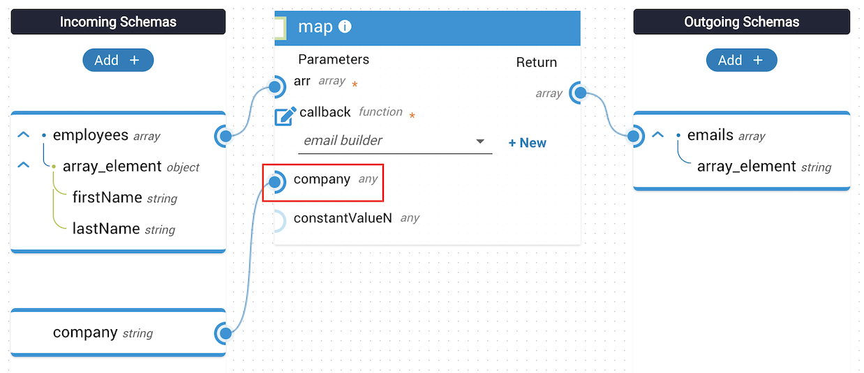 In this example, the employees array is passed to the map method. The JST takes this array and a provided company string and outputs an array of company emails. Because the company name is not available in the array parameter, it is passed in as a constant value to the callback function.