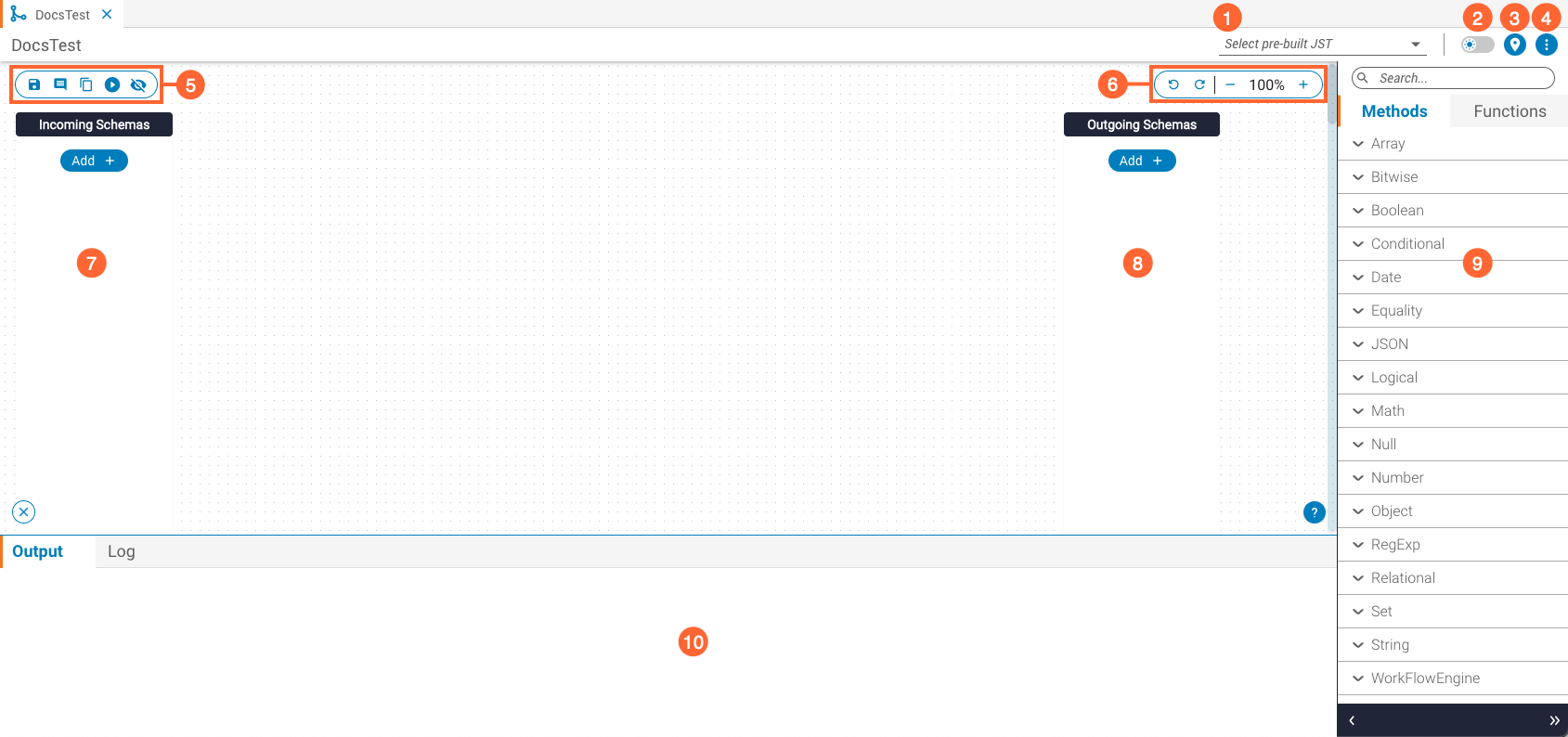 After you create or open a JST, it opens in the JST Designer canvas — the main interface for constructing a JST, including adding incoming and outgoing schemas, methods, and functions.